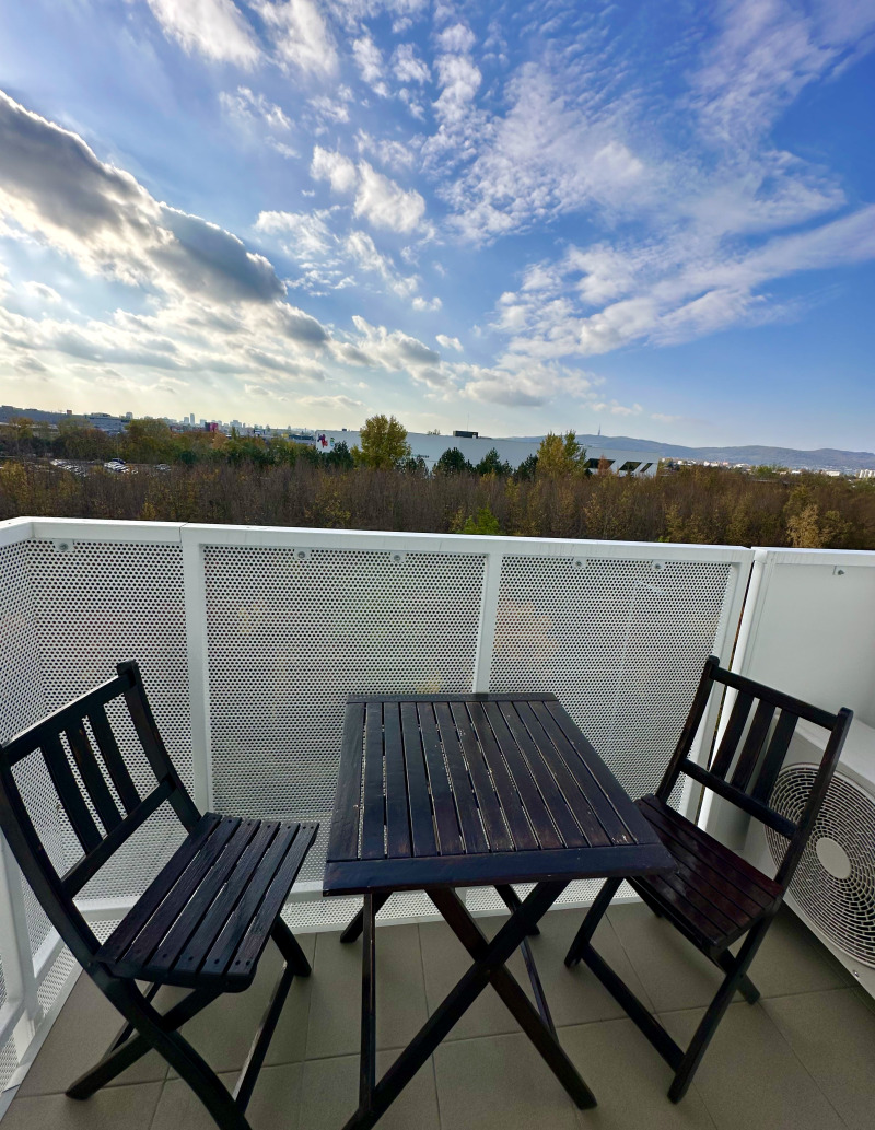 - balkón so stolíkom a dvoma stoličkami – ideálne miesto na rannú kávu či večerný relax