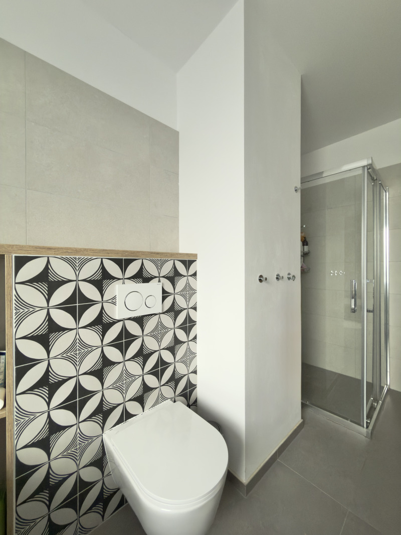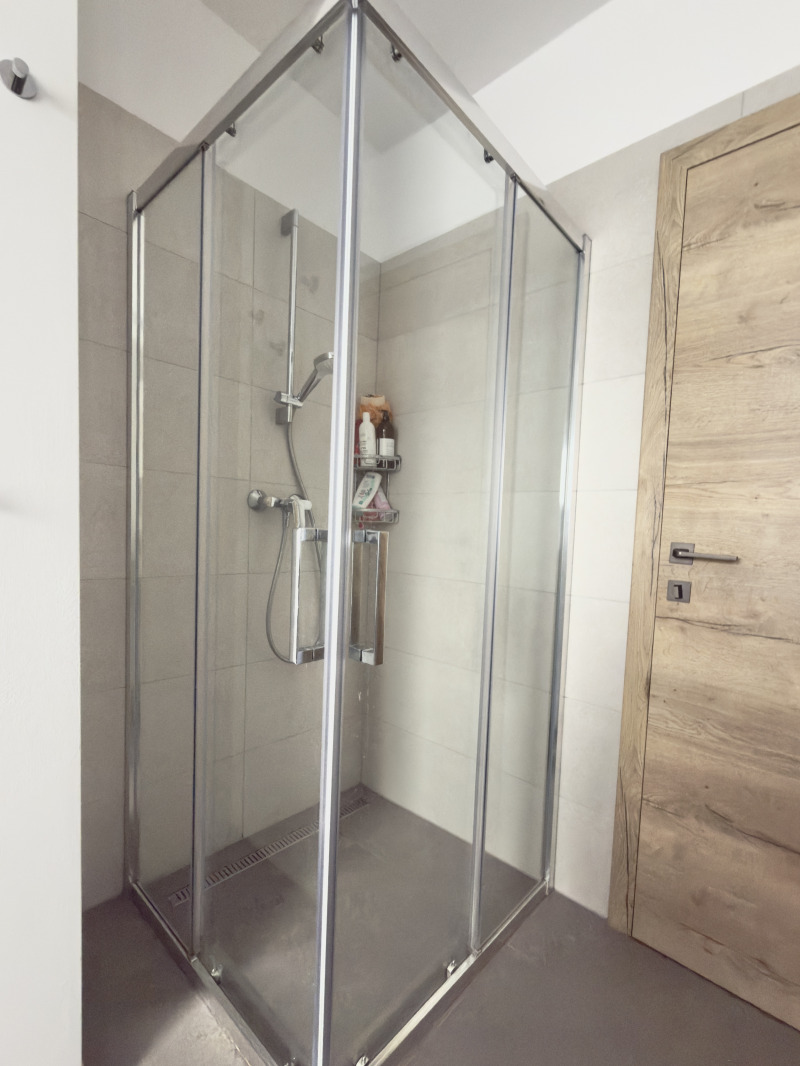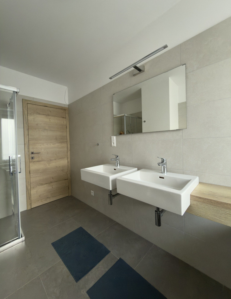 - kúpeľňa s vaňou, sprchovým kútom, dvoma umývadlami a toaletou