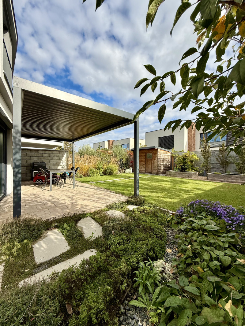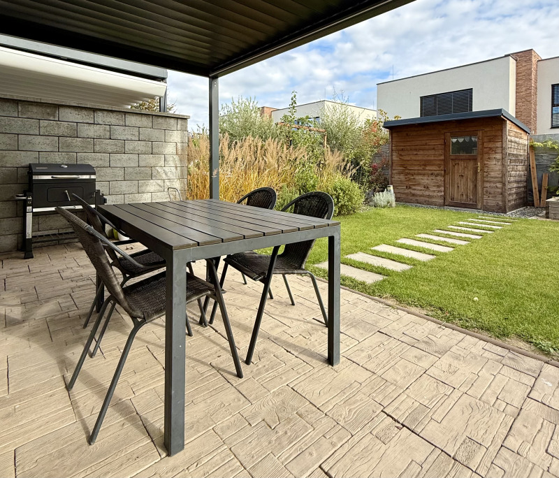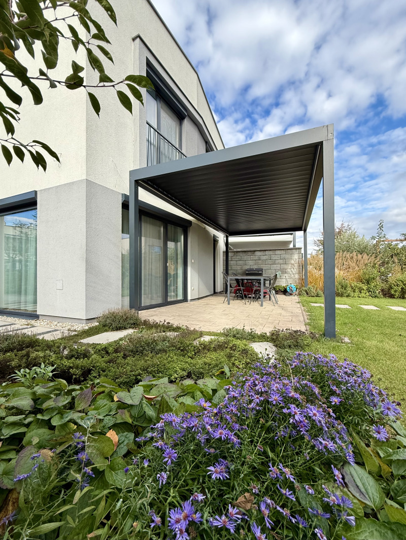 Priestranná terasa je prestrešená bioklimatickou pergolou.